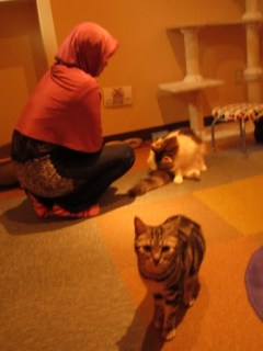 The cats sniffed around when we were came in, because we had food on us, but soon lost interest and went to curl up at various nooks and crannies of the shop, away from the hands.