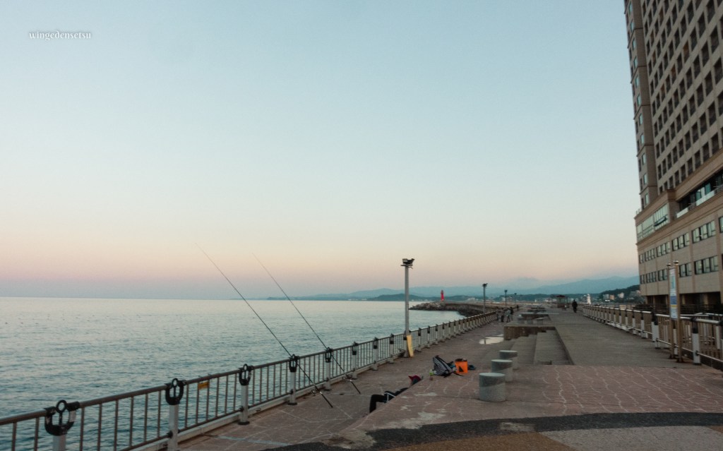 We were headed to Sokcho, a seaside town located in the northeastern part of South Korea. Sokcho is around 1.5 hour’s drive from the Gangchon Rail Park, and two hours by car from Seoul. It is located right by Mt. Seorak, home to Seoraksan National Park, and Sinheungsa Temple. A photo in Sokcho might have three elements in it – sea, land and mountains.
