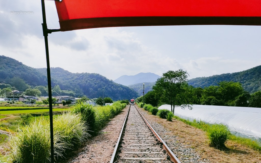 The Gangchon Rail Park is a converted old railway track with about 6 km of rail, which visitors can pedal on either on a 2-seater or 4-seater bike. The course weaves through the rural neighbourhoods and through a few experiential tunnels, with a part of the track running parallel to the Bukhan river (Bukhangang). There is no overtaking here 😂 since everyone is on the rail, in a fixed line.